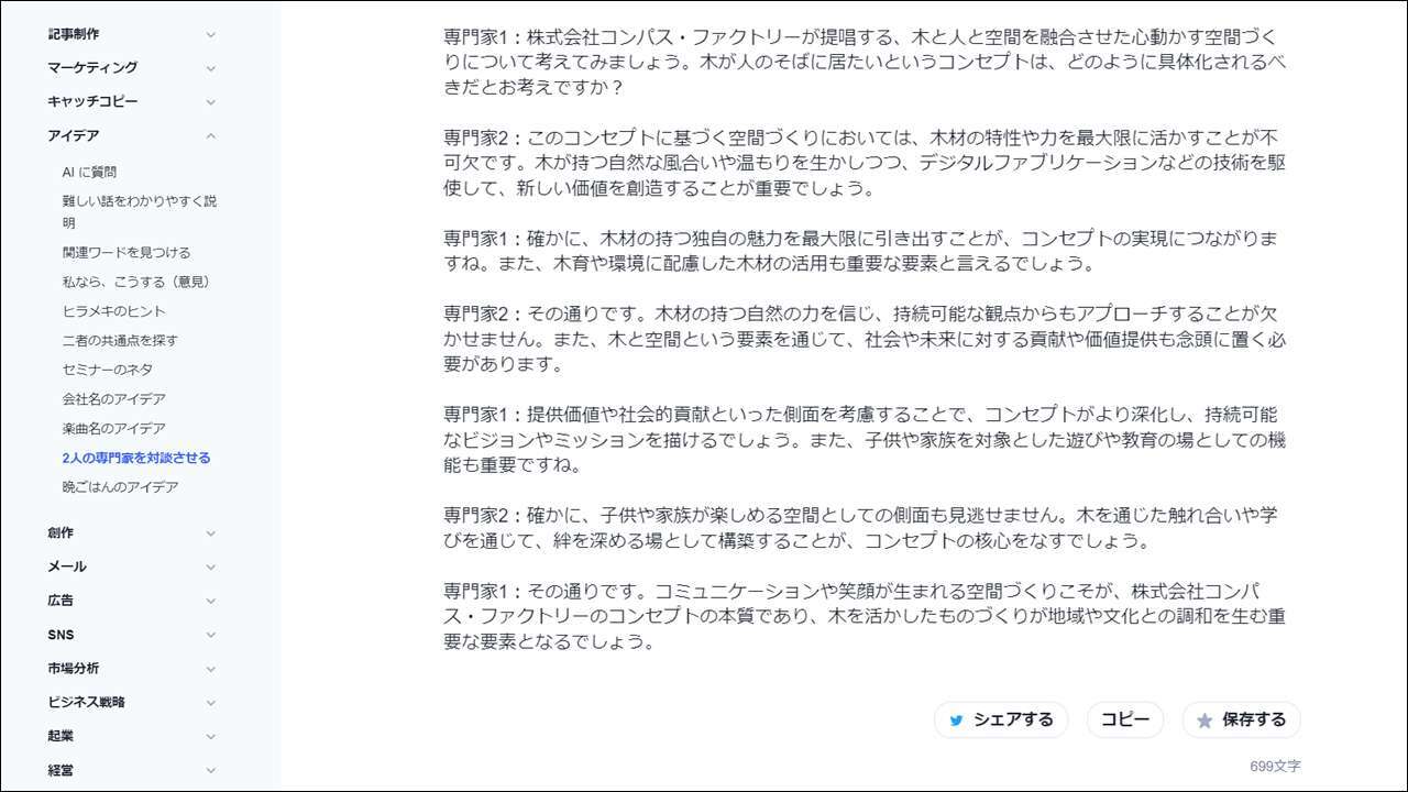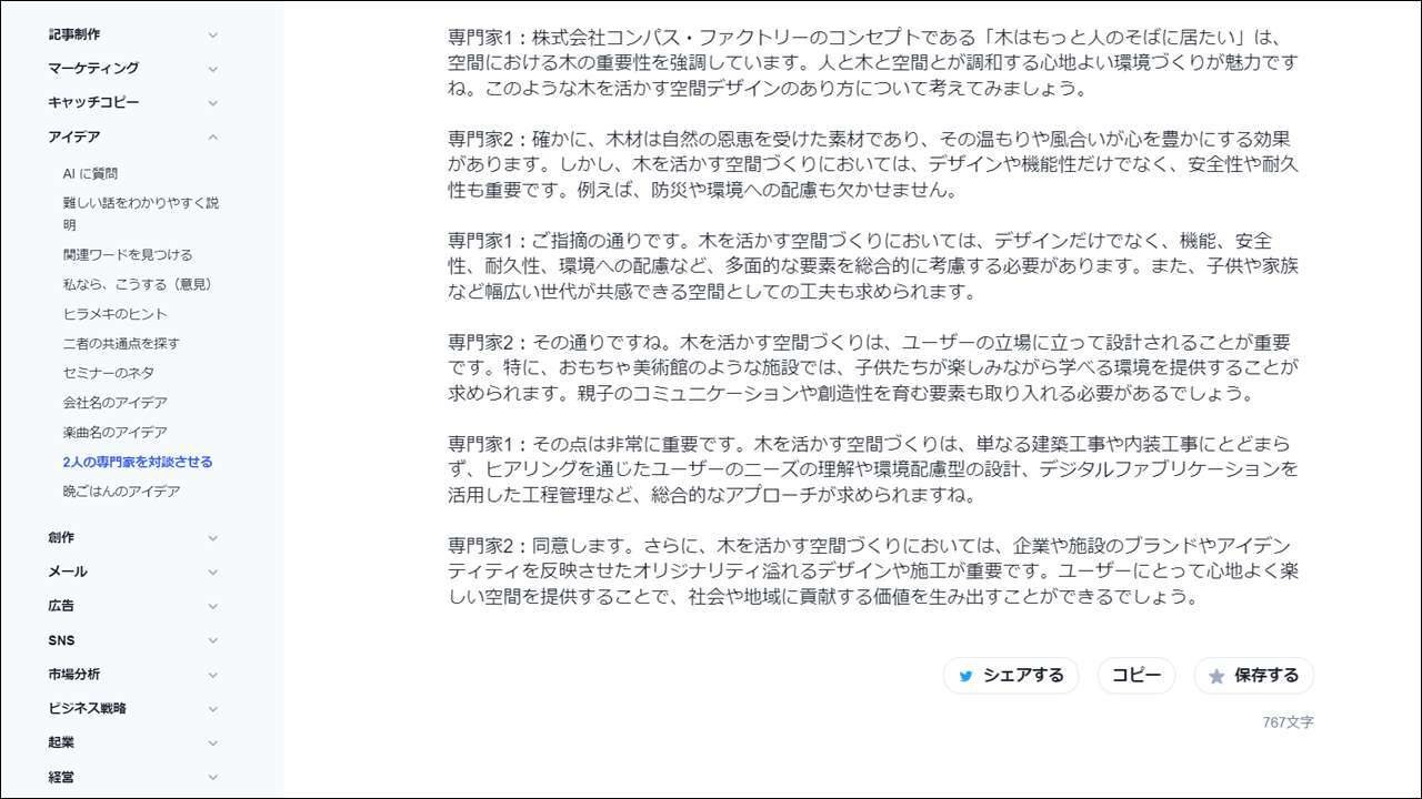 専門家1 「コミュニケーションや笑顔が生まれる空間づくりこそが、株式会社コンパス・ファクトリーのコンセプトの本質であり、木を活かしたものづくりが地域や文化との調和を生む重要な要素となるでしょう。」