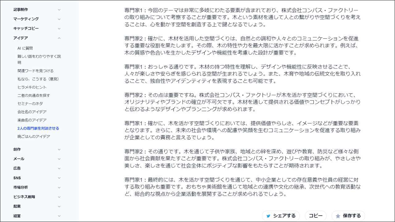 専門家2 「木を通じて子供や家族、地域との絆を深め、遊びや教育、防災など様々な側面から社会貢献を果たすことが重要です。株式会社コンパス・ファクトリーの取り組みが、やさしさや美しさ、楽しさを通じて社会全体にポジティブな影響をもたらすことが期待されます。」