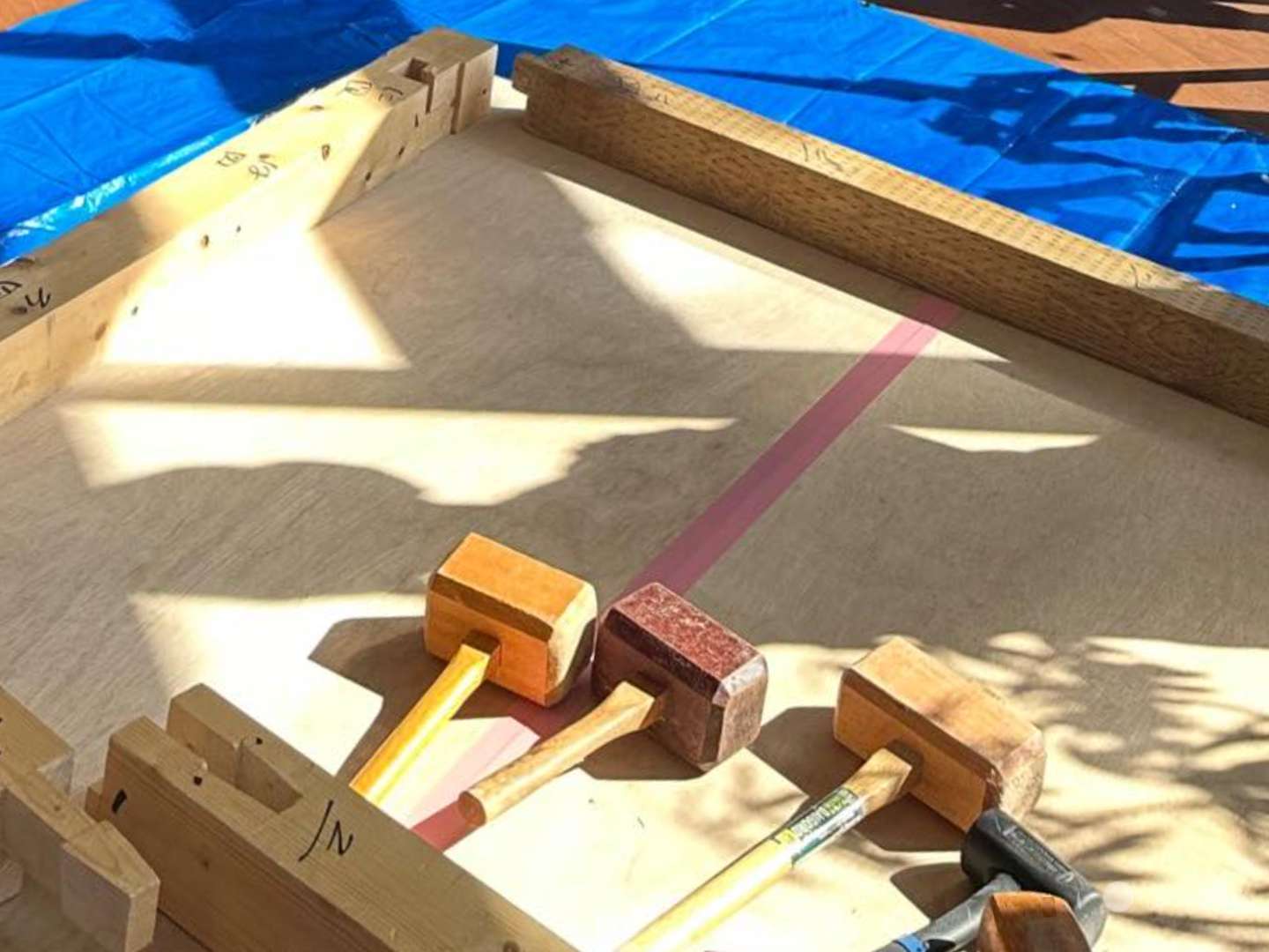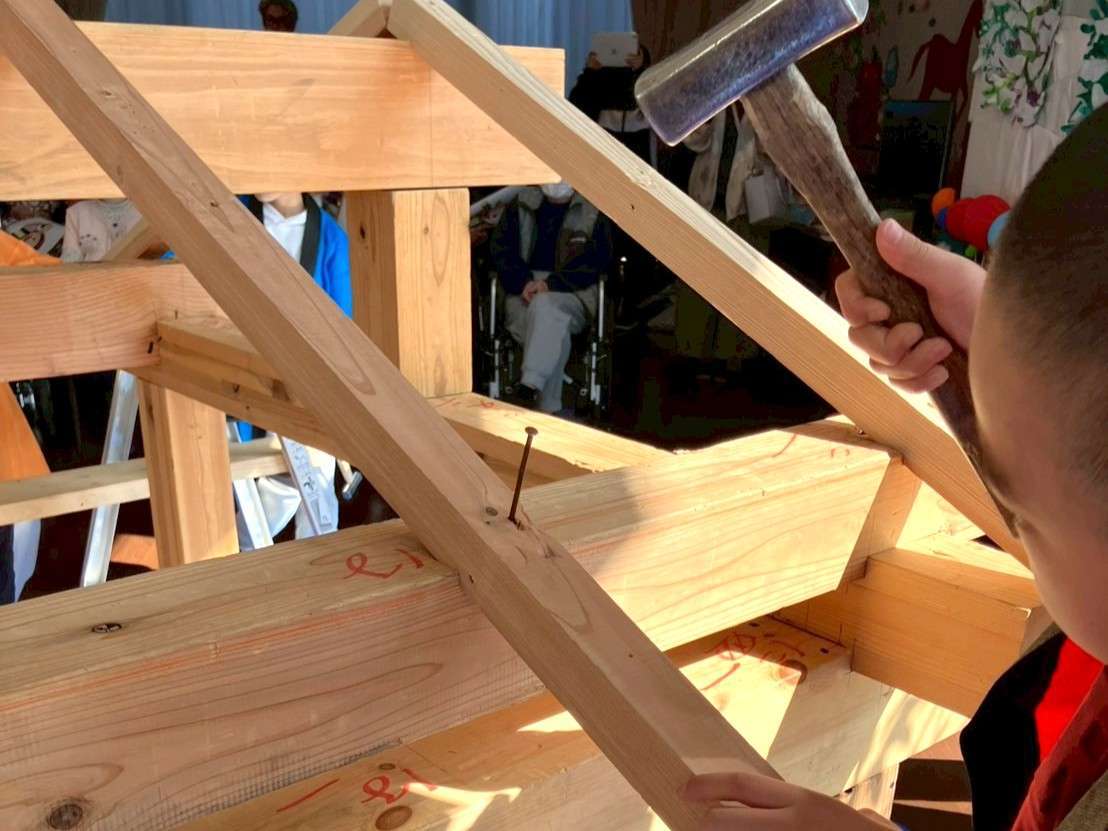 手や体を動かし、クギをしっかり狙い、金槌(かなづち)や木槌(きづち)でトントン音を鳴らしながら、家を建てていきました。